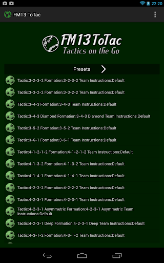 Application for football manager fans. Featuring exact representations of the team instructions and formation aspects of the game and all preset tactics, you can create, save and load your tactics on your phone or tablet when you are away from the game.