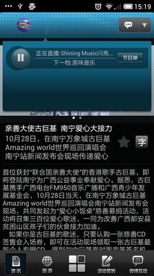 *引领都市潮流的时尚电台:广西第一家成功合作运营大型演唱会的媒体,创造商业演唱会最高票房纪录,囊括几乎所有大型演唱会及重大文体盛事的独家电台媒体合作。举办多项有影响的品牌公益活动,包括“送你一束康乃馨”、“名人物品空中义拍”、“爱心小饭桌捐资助学”等。*