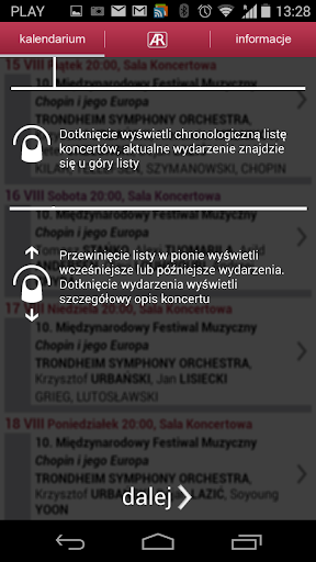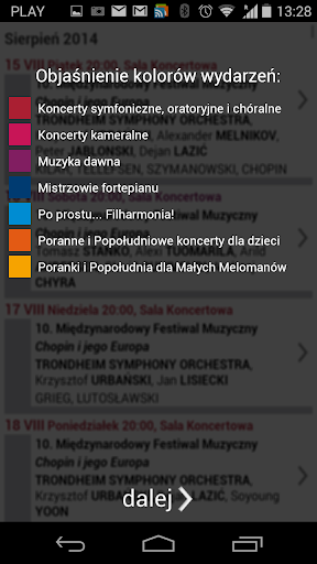 Aplikacja "FN" ujmuje całość (systematycznie aktualizowanych) propozycji koncertowych Filharmonii Narodowej w sezonie artystycznym 2014/2015. Omawia szczegółowo repertuar oraz wykonawców. Zawiera także informacje teleadresowe Filharmonii: aktywne numery telefonów i adresy mailowe, co umożliwia łatwy i bezpośredni kontakt osoby zainteresowanej z poszukiwanym działem.