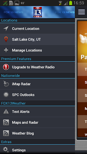 The FOX 13 Weather app is a full-featured weather app for the Salt Lake City area with the tools to keep you informed of weather news, current conditions and forecasts – all from the FOX 13 Weather Team. View the interactive radar, as well as stay alerted to any watches or warnings in the area – right on your phone.