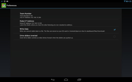The app mimics some of the features of the FIRST® provided Dashboard that runs on the control station computer. This app does not provide the enable/disable or watchdog features of the FRC® Dashboard - and the FRC® Dashboard is required to run the Robot.