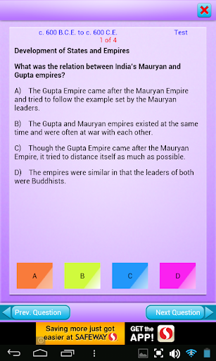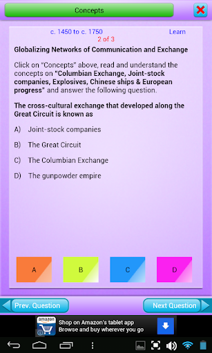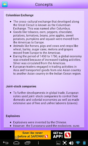 The app allows you to learn World History concepts in a very simple and user friendly manner. In the "Learn" mode of the app, you click on the "Concepts" button, review the "concept text" and then answer multiple choice questions related to the concept that you just reviewed.