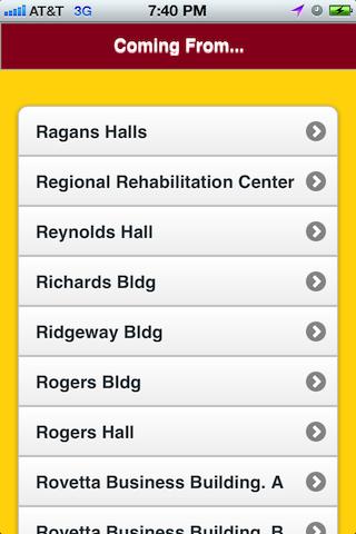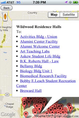Your position is shown on the map along with all of the campus buildings. Tapping on a building will bring up a list of other buildings to choose from indicating your destination. It will display four walking speeds and the time (in minutes) it will take to walk to the chosen building from the selected list.