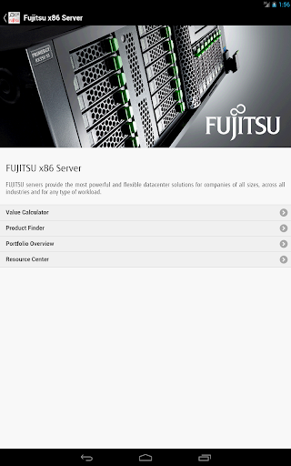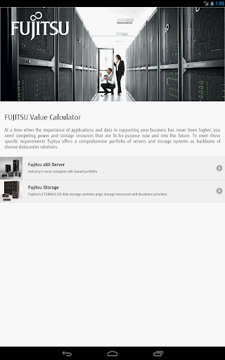 Fujitsu Value Calculator is a simple to use App which helps to pick out the business advantages of the Fujitsu hardware and find a server or storage system that suits your personal requirements. For better usability the App is divided into different sections: