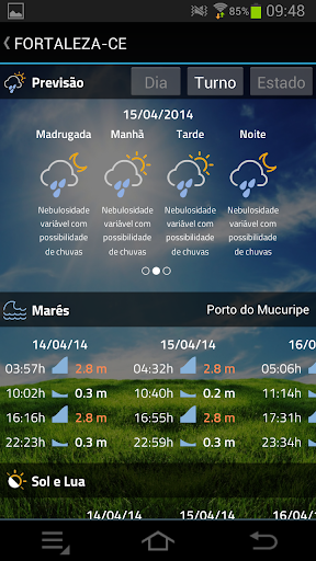 Todas as informações essenciais sobre o clima no Ceará que você venha a precisar estão agora a um clique de distancia. Apresentado de forma clara, elegante e com suas informações provenientes da FUNCEME, um instituto de pesquisa em Meteorologia e Recursos Hídricos para o Governo do Estado do Ceará. Também são feitas previsões para varias cidades da Região Nordeste do Brasil. Apesar de esta versão estar completamente operacional, nosso time está trabalhando duro em melhorias. Este aplicativo e suas atualizações são de graça.