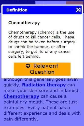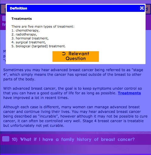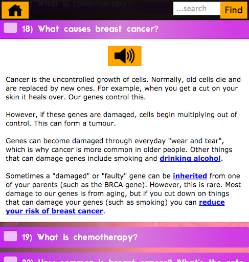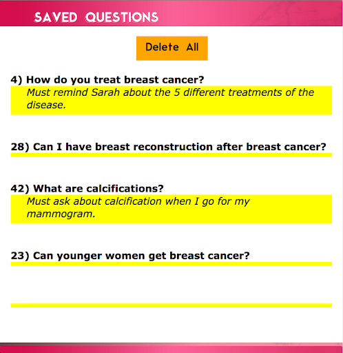 You can search for a particular question or keyword, look at different categories, or simply browse the top-50 questions and answers. It can be hard to remember all the questions you wanted to ask when you see your doctor, so you can save any questions that you would like to know more about, or even write your own using our handy “Notes” feature.