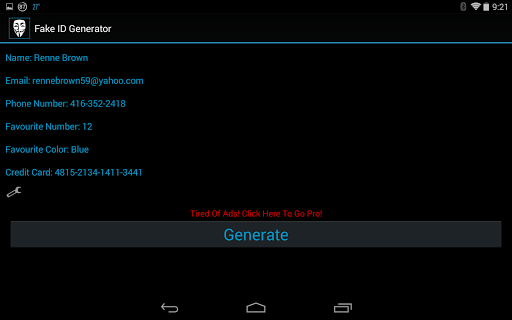 You can use the Fake Identifications you create in this app to fill out surveys asking for private information like your name, email, phone number etc , or use it to sign up for online services anonymously such as netflix, youtube, google, facebook, twitter, tumblr etc. By using this app's large data base of names you are able to create a fake id without fear of repetition or lack of randomness.