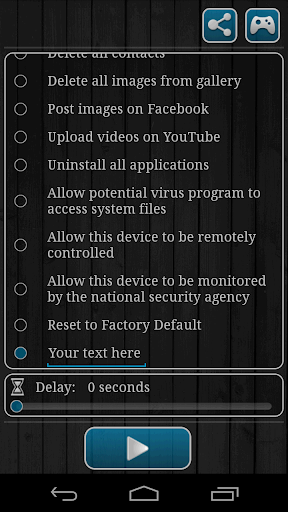 IMPORTANT: This application only displays a message, it does not actually perform any action like deleting contacts, photos, etc. As the title says: it's a prank, a fun game, and it's not real.