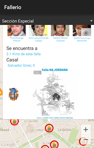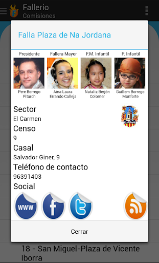Cada comisión de falla dispone en la aplicación de un apartado propio donde se encuentran todos los datos de la misma, desde fotografías de los representantes actuales hasta las principales noticias.