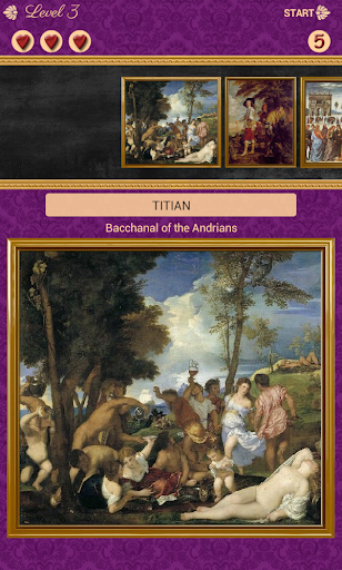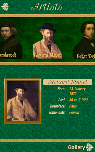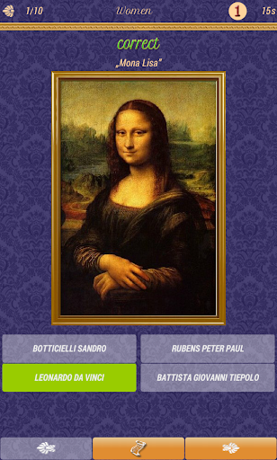 You have the opportunity to review the works of the greatest painters in the world. Amazing app to learn about the works of classic artists like: Sandro Botticelli, Leonardo da Vinci, Rembrandt, Edouard Manet, Edgar Degas, Claude Monet, Paul Gauguin, Vincent van Gogh. Test your familiarity with "famous paintings".