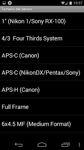 Fast DoF no usa interminables listas de modelos de cámara. En vez de ello, te permite escoger entre las categorías de sensor más habituales (desde móviles a gran formato).