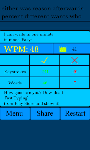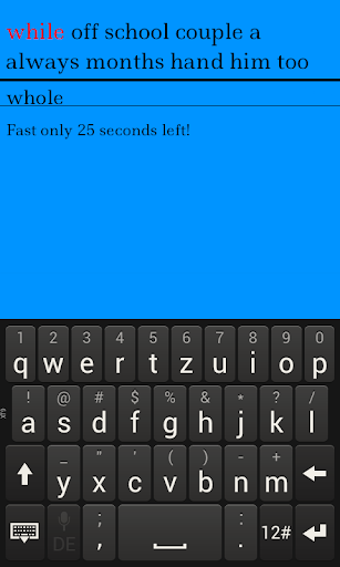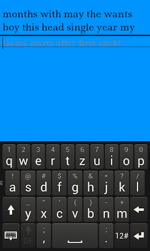 The goal is to type as many words as possible in one minute. At the end you can see your result which shows how many words per minute you can type (WPM = Words per minute, 1 WPM = 5 Keystrokes).