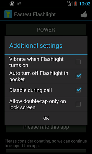 Double-click power button to turn Flashlight on, and it is easier to turn it off. Use this app to turn on your device's Flashlight as fast as possible - even without unlocking your phone. Just double-click your power button and the light goes on. When you finish, just put the phone in your pocket, and it'll automatically go off.
