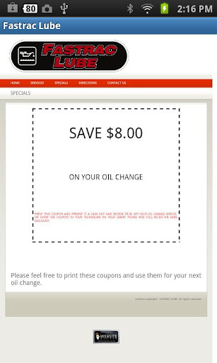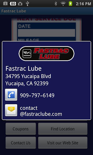 Other features include the ability to schedule a reminder on your calendar based on your vehicle's eSticker date and call up a map to find Fastrac Lube.