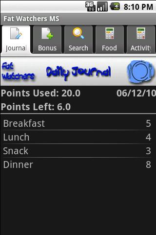 Fat Watchers Plus is great for points based diet programs like Weight Watchers to track and calculate food intake. No membership or internet connection required. This is the easiest WW app to use on the Android market. It now includes 58 full restaurant menus with over 11,000 items and a food listing with over 2,400 items!