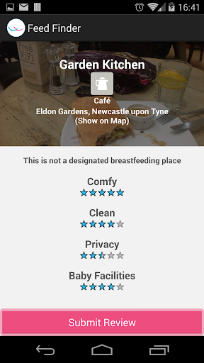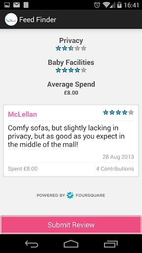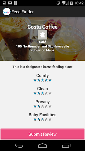 You can use FeedFinder to find places around you where other mothers have had positive breastfeeding experiences. Every recommended place on the map will have been reviewed by someone who's breastfeeding. You'll be able to see not only how they have rated that place, but also any handy comments that they have added about their experience or the location, like whether they have toys and a menu for toddlers, or where the breastfeeding room is if it's a bit difficult to find.