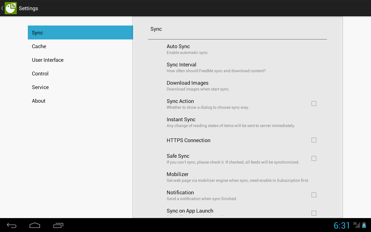 目前版本已基本可以同步(限wifi),但是必须到设置中选中“安全模式”。安全模式下所有订阅的源会一起同步,所以自定义同步源的功能无法使用(虽然在同步设置中可以保存,但是不起作用)。
