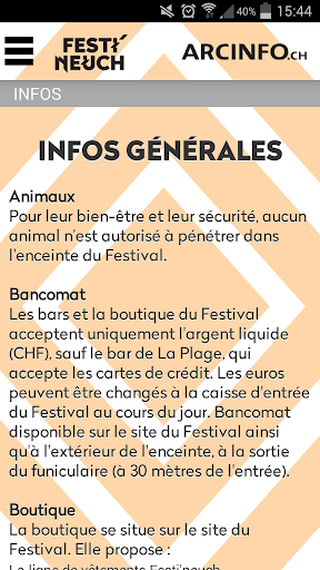 Festi'neuch, Neuchâtel openair festival, est un festival de musiques actuelles situé dans un cadre lacustre unique. Au mois de juin et quatre jours durant, le festival se déploie majestueusement sur les rives du lac de Neuchâtel. Accueillant près de 40'000 personnes, Festi'neuch est devenu en quelques années un événement incontournable en Suisse.