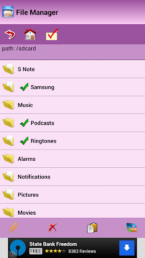 Green File Manager allows you to view all the files in the phone. It lets you to browse all the files and folders in the phone. You are also provided with the 'multi-select' option to select multiple files in the phone. This application also contains a footer bar that contains options to attach, delete, copy and move the files and folders in the phone. By long pressing a folder or file in the list, you will be provided with the file manipulation options like delete, rename, copy, move(cut),zip the folder, paste into folder and extract here options.