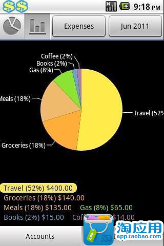 FinanTrak 是的记帐小帮手! 如有任何问题或建议, 请留言在 http://www.facebook.com/FinanTrak 或寄到 finantrak@gmail.com, 不然我无法回应您的疑问. FinanTrak 是个个人记帐软件. 它的主要功能包括: * 多个数据库: 可以为每个数据库设定不同的货币. * 多个帐户, 帐户种类, 4个帐户类别: 资产, 负债, 收入, 支出. 可以为每个帐户设定图形, 每月预算, 和初始结余. * 交易表单, 交易核对, 重复交易. 在交易表单中, 不只可以看到每个交易的金额, 结余, 及可用预算, 还可以看到每月总结. 你可以为每个帐户设定图形 (如购买产品的照片, 餐点的的照片, 或收据的照片...). * 圆饼图, 长条图. 可以让你清楚的了解你收入支出的分布. * 备份复原. 可让你备份多个数据库档案(除图片外)到SD记忆卡或Google的云端备份服务. 如果你把数据备份到云端, 当你更换移动电话并重新安装FinanTrak后, 数据将会自动复原. (云端备份需要Android 2.2或以上的版本.) * 密码保护, 密码加密. 密码加密后才存入数据库. * 帐户搜索 * 汇出至CSV 完整版只要美金$1.88. 喜欢的话, 请帮我加星, 不喜欢的话, 请让我知道哪里可以改进. 谢谢.