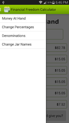 Financial Freedom Calculator will help you quickly determine how to divide your money for your jar system, whether that system is using envelopes or several bank accounts. The Calculator does all the work for you so you don't have to think about the calculations.