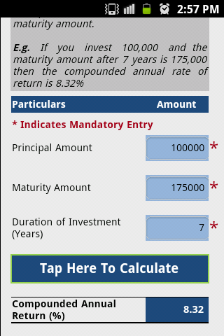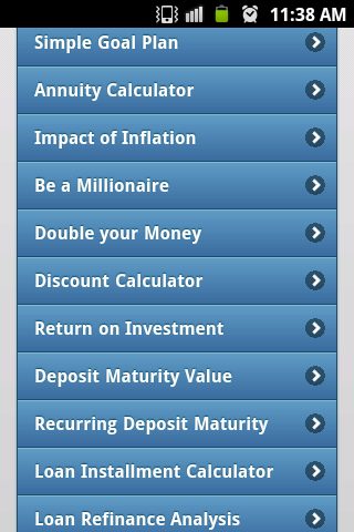 This mobile app consists of 12 financial calculators that may be useful to analyze various Financial Scenarios, Goals and Investments. You may also calculate monthly Loan installment payments, analyse Loan Refinance options and evaluate benefits of Loan Prepayment VS Investment with your surplus funds. Detailed explanation along with the examples is provided for all the calculators.