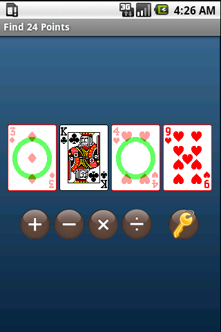 A game challenges your brain. Simply speaking, for arbitrary 4 cards from a poker except Jokers, players is required to count 24 points upon these 4 cards only through plus(+), minus(-), multiplication(x) and division(/), where A=1, J=11, Q=12, K=13. For example, given 4 cards: 7, Q, K and 7, in that case, there may be a few solutions, e.g. (7x7)-(13+12) is such one.