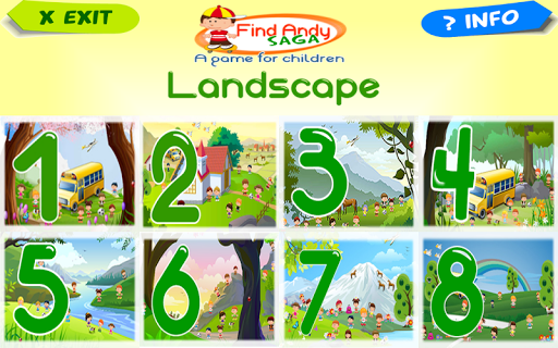 This version "Landscape" contains scenarios in the outdoor field, you have to find Andy with his skateboard, and other objects and animals, while listening to the sound of nature.