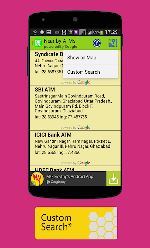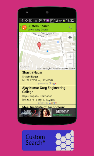 .Custom Search* helps you to search any place or address and show the searched place or address on map with all the near by places and its address.