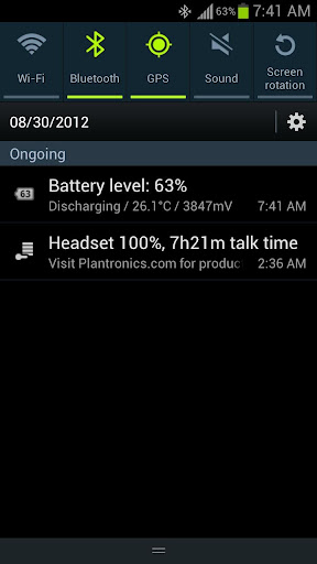 If your phone/tablet is running Android OS 3.X, 4.0.X, 4.1.X, 4.2.2*, 4.3 or 4.4 and it is paired and connected to any of the following Plantronics headsets, an on-screen headset battery meter icon will appear in your device’s Status Bar and a talk-time estimate for your headset will be included in your Notifications list. Compatible headsets include: