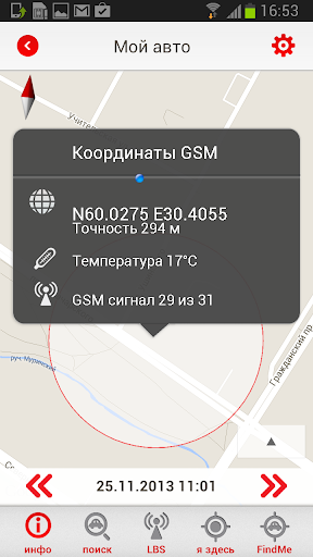 FindMe application displays location coordinates, their transmission time and accuracy, travel speed, temperature and signal strength for each vehicle with the beacon fixed. The data is available both for current time and selected date. Monitoring and management are exercised for all search beacons registered in the personal account on the website http://www.911.fm/ru.
