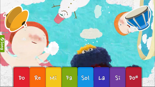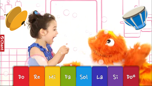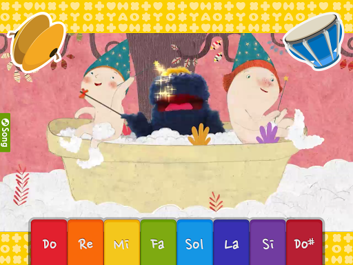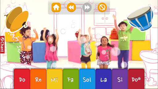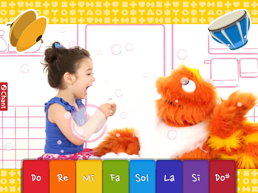 (5) 악기 버튼: 심벌즈, 드럼, 피아노 건반의 아이콘을 누르며 악기를 연주하듯 챈트와 송을 따라할 수 있습니다.