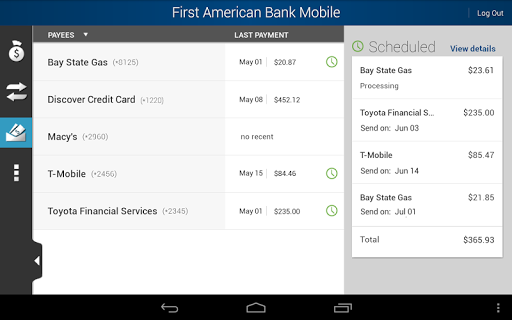 With the First American Bank Mobile App you can check your balances, pay bills, view and activate your cash back offers, deposit checks (phone only at this time--tablet check deposit coming soon), and find branches & ATM's near you. First American Bank. Building Relationships that Last since 1903.