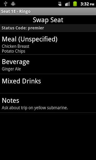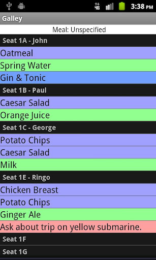 Assists first class flight attendants by tracking passengers' food and drink requests, with names, color-coded status, text notes, and check items. Requested and field tested by flight attendants, 134 supported aircraft, seating view and galley view. Provides standard meal, food, beverage, and mixed drink lists, that can be edited, added, and deleted.