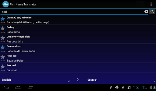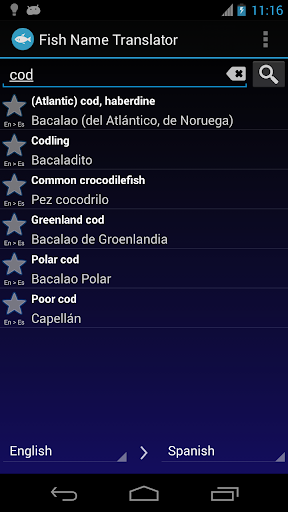 Fish Name Translator will help you translate over 600 fish, mollusk and crustacean names in 6 different languages: