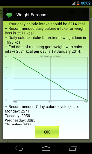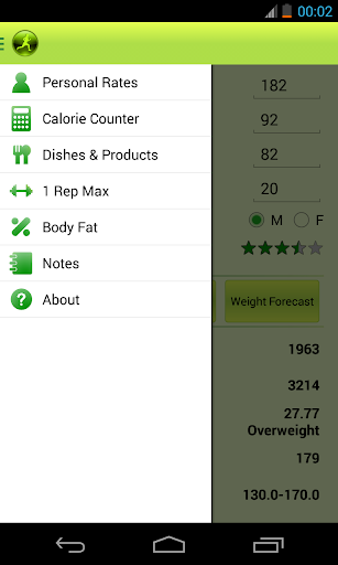 * Personal rates (BMI, RMR, daily calorie and water intake, maximum heart rate, training heart rate; also includes recommendations and future weight forecast);