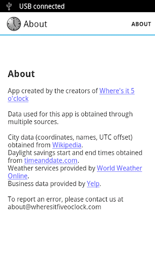 A simple app that tells you where it is currently 5 o'clock in the world. It includes weather data and a map of the location.