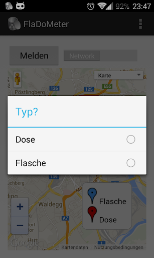 dient zum einfachen Melden von Dosen/Flaschen die in der Landschaft deponiert wurden. Beim Melden wird die derzeitige Position der Nutzers anonym an die FlaDoMeter Website gesendet und damit die Dose/Flasche auf der Karte markiert. Diese Markierung ist nun auch für alle Nutzer der App und Website-Besucher sichtbar.