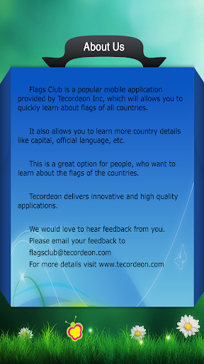 Flags Club is World country flags information and educational app. There are totally 194 Country Flags present in Flags Club. Flags Club is a great world country flags Learning app for those who want to learn about National Flags and World Geography. Apart from Country Flags, Users can also learn, National Languages, Country Capitals, and the country geographical locations. This Android app is highly interactive and useful to learn World Countries and their Flags, Country Capital cities, Country National Languages. Learning about Geography and Country, Capital, and National Language of the world countries is now fun and exciting.