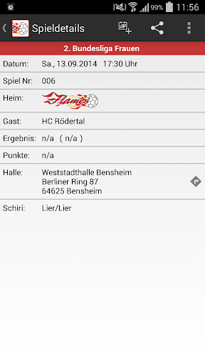 - Details zu einem Spiel (z.B. Datum, Uhrzeit, Halbzeitergebnis, Schiedsrichteransetzung, Hallenanschrift etc.)