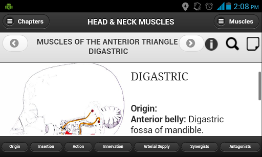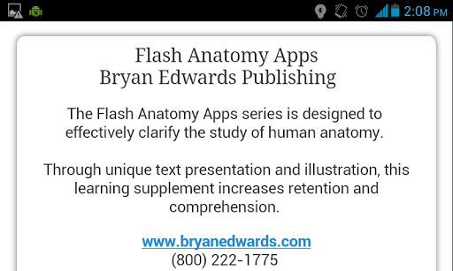 The Flash Anatomy Head & Neck Muscles app is based on the set of flash cards with the same title published by Bryan Edwards Publishing. The app presents a unique study approach of repetition that aids the student's ability to recall pertinent information relating to the muscular system. The individual cards illustrate every functional muscle from the neck up, denoting the origin, insertion, action, innervation, arterial supply, synergists and antagonists. It includes two-color illustrations, terminology, and definitions of movement.