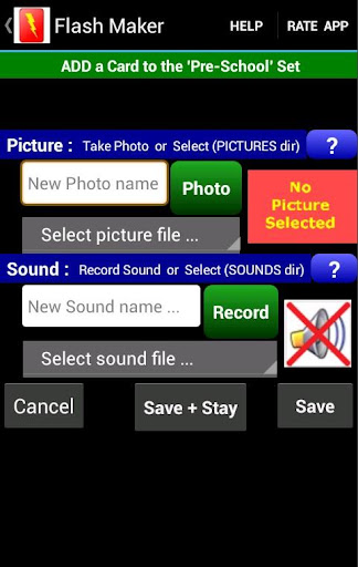 If you already have images or sounds that you would like to use, put them into the 'PICTURES' and/or 'SOUNDS' folders (created by the App) and select them via the appropriate drop-down spinners.