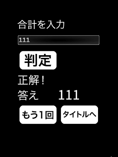 遊び方:数字が連続で表示されるので、その合計を計算して、結果画面で答え合わせ!