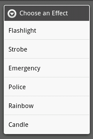 Change the color and brightness of your phone's screen to help guide you where you want to go. Choose from a full range of colors to find your favorite custom-made light. Make fun flashlight effects by tapping on the menu button and choosing effect, color, and brightness.