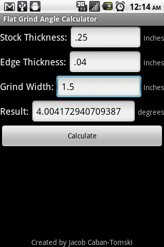 Simple calculator application that uses Dwight Huges's formula to calculate the angle for a flat grind. More information is available here: http://knifedogs.com/showthread.php?7000-Flat-grind-angle-formula&highlight=flat+grind+calculator