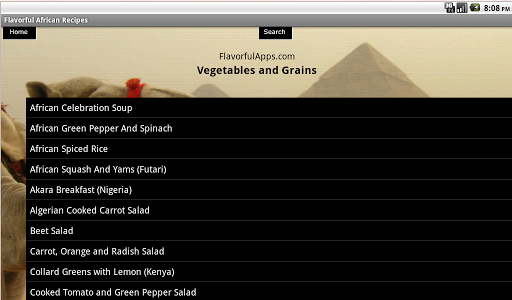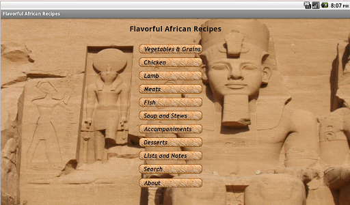 Authentic African Recipes! This powerful cooking app features categorized recipes for African cuisine. The recipes are searchable by name and searchable by ingredient, allowing you to build an exciting menu around the food items that you have on hand.
