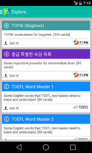 ::Explore - pre-installed flashcard packs including useful words and phrases for TOEFL, TOPIK, GRE, ..