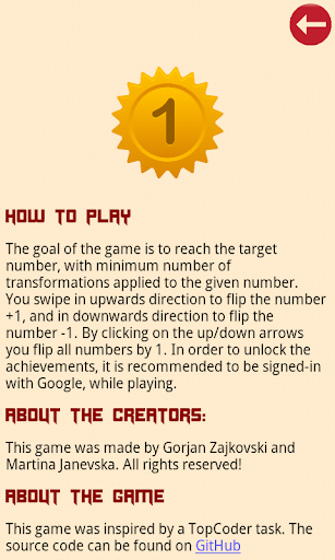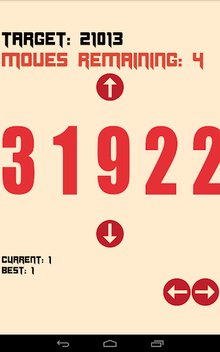 Flip Numbers is a puzzle game consisting of two numbers, a starting number and a target number. The objective of the game is to get from the starting number, to the the target number using minimum number of transformations. You transform a number, by flipping any of its five digits up, or down, or by flipping all the digits at once. As you progress through the game, the levels get harder, and more transformations is needed to reach the target number.