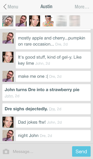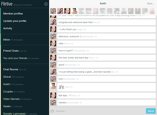 Flirtive has private and public chat rooms where we talk about our jobs, our relationships, video games, food, movies, and Chris Pratt. We share links to our favorite stuff, post pictures of our pets, and keep each other company.