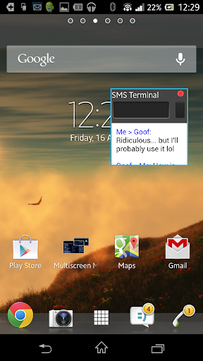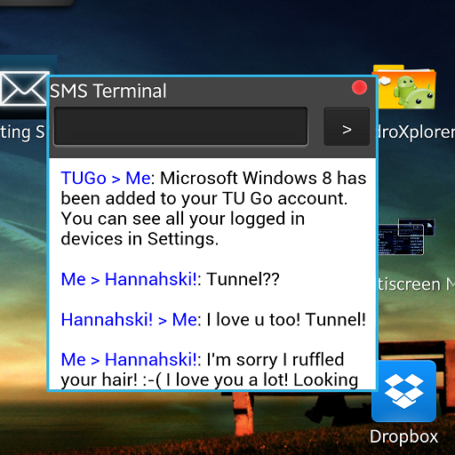 This app is a floating text messaging terminal that sits on top of other activities and allows you to text friends while you're using other apps - while playing Angry Birds for instance! Resize by pinching, or minimize it into the corner of the screen. Then, when you want to send a message, just pop it back out and write without interrupting what you're doing! Better yet, when you receive a message, it will pop right out at you for you to answer or dismiss so that you never miss an important message again!